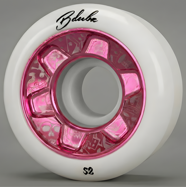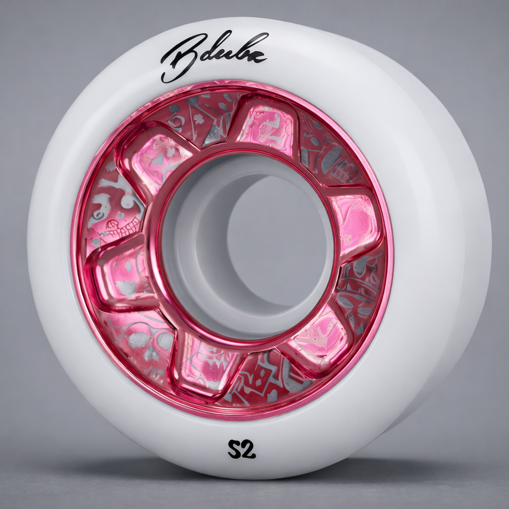 "All in. The High Roller Starcore, aluminum core skate wheels. Featuring our signature high-performance white urethane wrapped around a precision-engraved alloy pink anodized core. Look closer to see the intricate skulls and playing card details etched directly into the metal—a tribute to those who risk it all for the clip. Lightweight strength, premium detail, and the smoothest roll in the game."